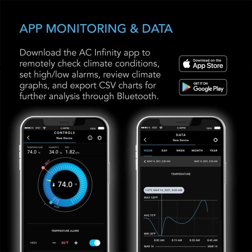 Connect to the AC Infinity app for access to greater control of this smart hygrometer. This includes remote climate readings, trigger alarm programming, and calibrations of temperature, humidity, and VPD readings. You can also receive custom push notifications on your smart device for rapid response to sharp peaks and dips. See historical climate data graphs to track trends and export as a CSV spreadsheet for further analysis.
