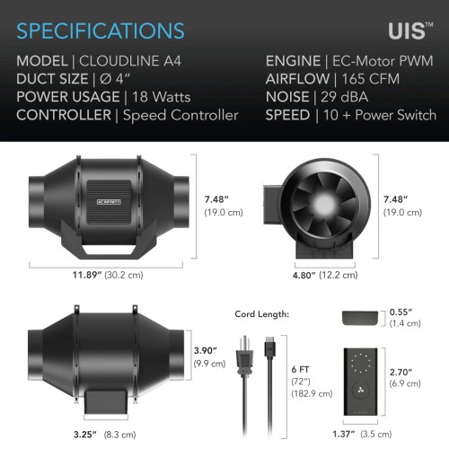 This inline fan system packs the CLOUDLINE’s core innovations and premium build quality together to bring you a value package. Designed to quietly cool grow tents, rooms, and closets, and provide ventilation in various air circulation and exhaust projects. Containing an inline mixed-flow design, the duct fan can maintain airflow even in high static pressure applications. The motor box containing the fan’s impeller and blades can be detached from the mounted frame for easy cleaning and maintenance. Complete kit includes one inline fan unit, one speed controller, UIS to 4-pin Molex dongle, installation manual, and all necessary mounting hardware. This product is a part of the UIS™ platform of grow devices and smart controllers, designed to integrate with each other to achieve your ideal environment.