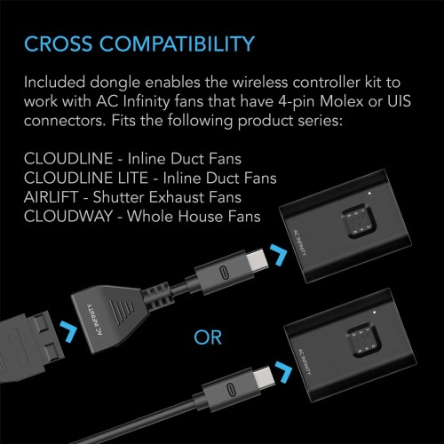 Each wireless fan remote kit includes a dongle that enables use with AC Infinity fans built with UIS and Molex connectors. Compatible EC-motor cooling fans include: