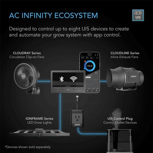 Devices within the UIS™ ecosystem which includes all AC Infinity LED grow lights and EC fans are compatible. Compatible AC Infinity series devices include: