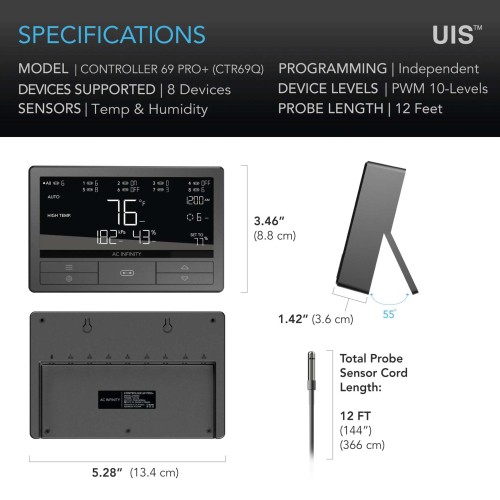 A next-gen controller designed to provide AC Infinity devices with smart programming to produce the most optimized environment. This central command unit connects with up to eight different devices from fans to lights to provide each with independent climate and time-based programming. The backlit display reads temperature in Fahrenheit or Celsius and can be switched off while programs run in the background. Built with a kickstand and includes hardware to be hung on walls. The 12-foot sensor probe with thermal-alloy head accurately detects current temperature and humidity. It also detects VPD (vapor pressure deficit), which measures ambient temperature, relative humidity, and the plant’s leaf temperature in order to determine the optimal atmosphere. This allows you to monitor growing conditions more closely than if you were to rely on temperature and humidity alone. This product is a part of the UIS™ platform of grow devices and smart controllers, designed to integrate with each other to achieve your ideal environment.