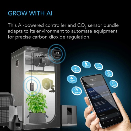The CONTROLLER AI+ is the first to harness artificial intelligence for universal device control and complete oversight of your grow. This bundle includes our innovative CO2 sensor, which features adaptive self-learning to automate the critical task of monitoring and maintaining optimal CO2 levels, ensuring healthy and thriving plant growth. Using AI-derived insight, this self-automating controller can provide unparalleled accuracy and stability while avoiding extreme environmental spikes. Connect to up to 32 UIS™ devices (when using splitter hubs) like fans, grow lights, humidifiers, and heaters to optimize your grow space’s temperature, humidity, and VPD levels. It also features smart outdoor monitoring that tracks the climate inside and outside your tent for even greater oversight. A reliable ecosystem, this intelligent platform can retain programming even if it's disconnected from Wi-Fi so your grow remains safe and thriving. This product is a part of the UIS™ platform of grow devices and smart controllers, designed to unite with the AC Infinity app over Wi-Fi to achieve your ideal environment.