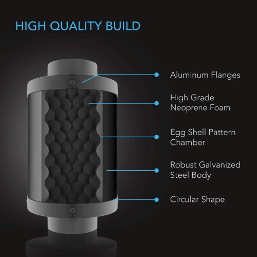 A ventilation ducting tool designed to dampen or reduce noise coming from airflow in grow tent or server closet ventilation systems. It utilizes high-grade neoprene foam crafted in a wave crest pattern that diminishes sound wave movement, reducing noise pollution by up to 50%. The egg crate foam muffles sound vibration while allowing maximum airflow passthrough for both intake and exhaust configurations. Both aluminium flange openings also assist in absorbing sound waves from vibrations, seamlessly fitting over your inline duct fan’s flange. Each silencer is built with a solid galvanized steel body that is corrosion-resistant and can withstand extreme temperature changes.