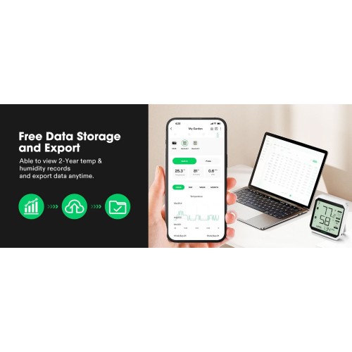 • 2-Year Free Data Storage: This indoor temp & humidity gauge offers a 2-year free data storage service, allowing you to analyze the historical temp & humidity data and make adjustments accordingly; You can also easily export the data at any time