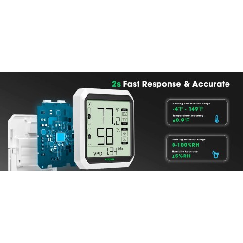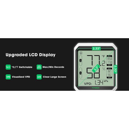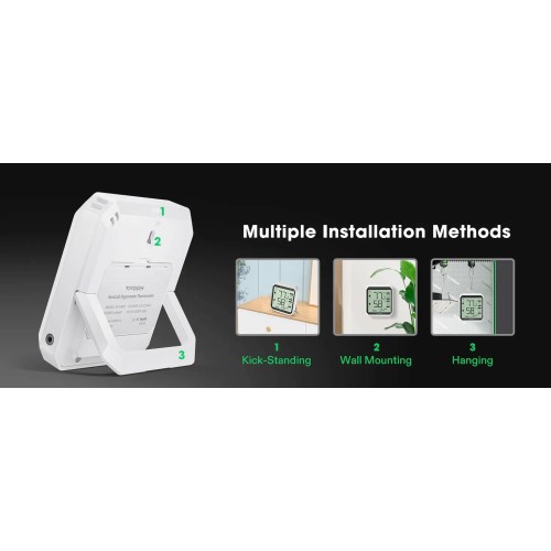• User-Friendly Design: Easy to use with a big, clear LCD screen, visualized VPD design, highest and lowest temp & humidity records, and indicators for three comfort ranges for temp and humidity; Multiple installation methods are available – wall mounting, kick-standing, and hanging