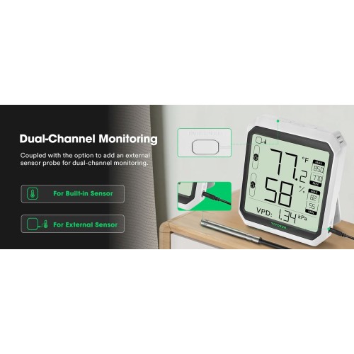 • High Accuracy & Dual Channels: Utilizing a built-in smart Swiss sensor, coupled with the option to incorporate an external sensor probe for dual-channel monitoring, this wireless thermometer hygrometer delivers rapid, real-time, and highly accurate temp & humidity readings (±0.9℉/±5%RH)