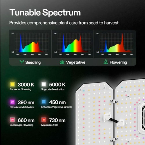 • Full-Spectrum Sun-Like Lighting: With Samsung 301B diodes, these LEDs deliver optimal full-spectrum light coverage (390nm-730nm, 3000K, 5000K), including 660nm deep red, 730nm far red & 395nm UVA; This design ensures maximum PAR output, improving germination rates, promoting plant growth, prolonging blooming periods, and increasing yields.