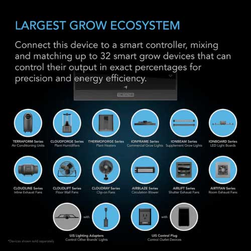 A grow tent air filtration system with all the necessary inline components you need to ventilate your grow space. By assembling these essential pieces, this package will help you quickly get your grow build started and eliminate the guesswork of purchasing them individually. This inline fan kit features the CLOUDLINE LITE Series fan with 10-speed controller, capable of delivering powerful yet quieter performance. Paired with a carbon filter using Australian virgin charcoal to block odors from seeping out of your grow tent. These two pieces are connected by a set of flexible ducting with four layers of protection to properly direct airflow away. Accessories include duct clamps, prefilter cloth, rope clip hangers, and hanging straps to complete the installation. This product is a part of the UIS™ platform of grow devices and smart controllers, designed to integrate with each other to achieve your ideal environment.