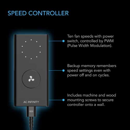 A 10-speed fan controller is paired with this inline fan to optimize airflow levels and noise in many applications. The fan’s PWM controls enable it to smoothly set fan speeds and operate at extremely low RPMs with no motor noise. Along with this wired speed controller, the CLOUDLINE is also compatible with the following controllers: