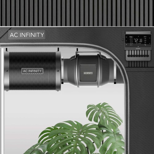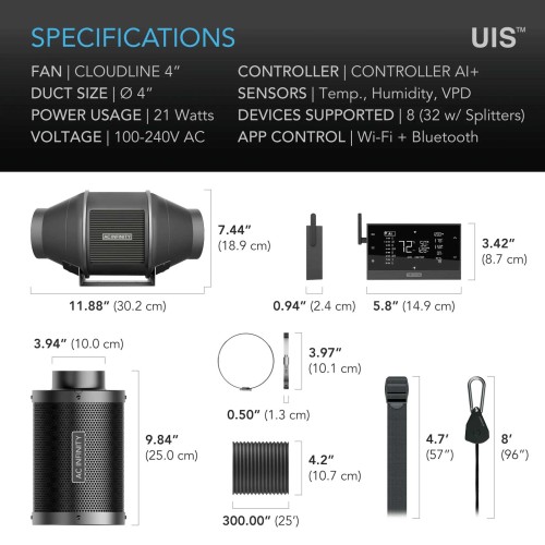A grow tent air filtration system with all the inline components you need to ventilate your grow space. By assembling these essential pieces, this package will help you quickly start your grow build and eliminate the guesswork of purchasing them individually. This kit features the CLOUDLINE inline duct fan that can deliver a powerful yet quieter performance. It is controlled by the first AI-powered controller for self-automating programming with anticipatory insight that ensures exact percentage output. Paired with a rust-resistant carbon filter with a gunmetal finish using Australian virgin charcoal to block odors from seeping out of your grow tent. These ducting components are connected by flexible ducting with four layers of protection to direct airflow properly. Accessories include duct clamps, prefilter cloth, rope clip hangers, and hanging straps to complete the installation. This product is a part of the UIS™ platform of grow devices and smart controllers, designed to integrate with each other to achieve your ideal environment.
