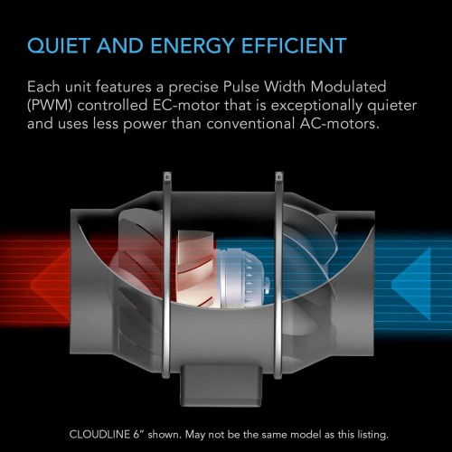 The included CLOUDLINE Series inline fan features a PWM-controlled EC motor, enabling smooth operation at low RPM speeds with no additional heat or noise. It achieves high-performance airflow fit for grow tents thanks to its mixed-flow design and its use of stator blades and hydrodynamic wind circles. Dual ball bearings give this inline fan a 67,000-hour lifespan, which is backed by its IP-44 sealing that resists dust and splashing liquids.