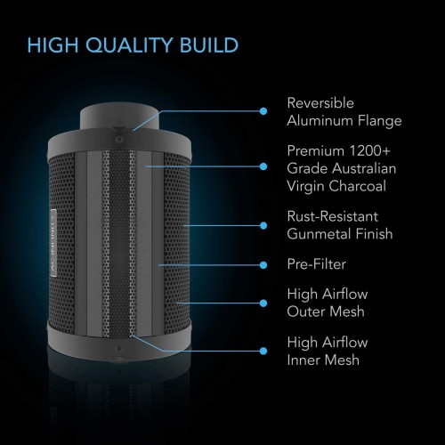 The duct carbon filter effectively blocks unwanted odors and chemicals using its bed of premium Australian charcoal. Featuring a 1200+ IAV rating, the activated carbon supports clean airflow more efficiently, thanks to its increased adsorption rate and extended life rating. The filter’s durable steel mesh body is protected by a powder-coated gunmetal finish to defend against rust and corrosion in high-humidity growing environments.