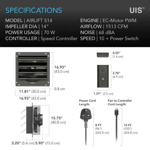 Airlift S14, Shutter Exhaust Ventilation Fan 14", Speed Controller by AC Infinity