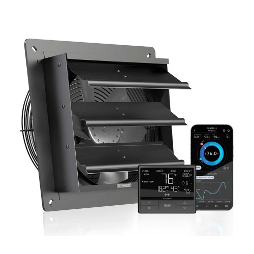 A high-airflow exhaust fan designed to cool and ventilate greenhouses, garages, attics, workshops, and sheds. The system can automatically eliminate heat, moisture, odor, and dust from enclosures, rooms, and buildings. Includes a smart controller with dynamic climate and time-based programming and can connect to multiple UIS devices. Innovative EC motor with PWM control maximizes airflow while reducing energy consumption and noise levels. Heavy-duty build features aluminum blades, steel wire guards, and steel shutters. This product is a part of the UIS™ platform of grow devices and smart controllers, designed to integrate with each other to achieve your ideal environment.