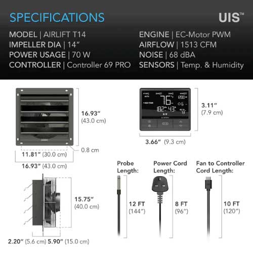 Airlift T14, Shutter Exhaust Ventilation Fan 14", Temperature Humidity Controller by AC Infinity