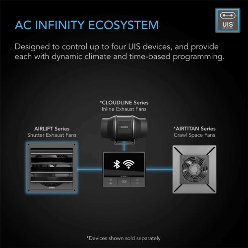 CONTROLLER 69 PRO features smart programming that not only has basic temperature, humidity, and VPD triggers but also allows you to set dynamic fan speeds that would respond based on their changes. Go even further by setting a minimum speed that the fan will run at constantly and would only increase when triggered. Timer, cycle, and schedule modes add custom on-demand activation for various uses. Securely connect to the AC Infinity app via WiFi to utilize automation capabilities from anywhere throughout the day. Access your fan remotely, unlock advance programs, set notifications, view historical climate charts, and export CSV data. This controller can mix and match connectivity between AIRLIFT Series shutter fans, CLOUDLINE Series inline fans, and AIRTITAN Series crawlspace fans.