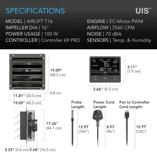 Airlift T16, Shutter Exhaust Ventilation Fan 16", Temperature Humidity Controller by AC Infinity