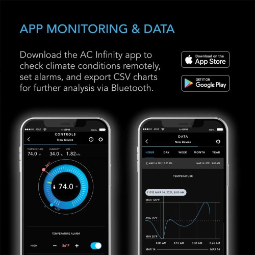 Connect to the AC Infinity app via Bluetooth to access all that this climate sensor has to offer. This includes remote climate readings, and trigger alarm programming, as well as calibrated temperature, humidity, and VPD readings. You can also receive custom push notifications on your smart device for rapid response to sharp peaks and dips. See historical climate data graphs to track trends and export them as a CSV spreadsheet for further analysis.
