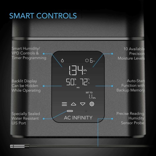 - Features VPD and humidity triggers, timers, a hidable backlit display, and auto-start with backup memory.