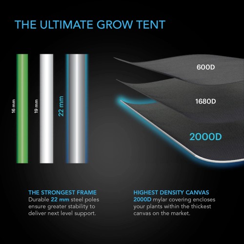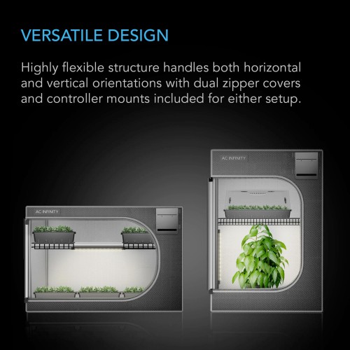 A propagation tent designed to promote successful germination and early plant growth by creating a well-regulated grow space environment. The multipurpose structure functions both vertically and horizontally to best serve your growing needs, with dual zippered covers and controller mounts included for either arrangement. This enables you to create many configurations inside this grow tent and customize how you start your seeds. Its structure is made of a heavy-duty 22mm steel frame, which is built to handle the substantial weight of growing materials and equipment. 2000D mylar canvas protects the structure while sealing in humidity, and even includes viewing windows so you can check on your grow without affecting the interior climate.