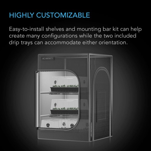 This highly adaptable grow tent includes a wide range of potential configurations to support seedling trays and planters. Easy-to-install shelves and mounting bars offer even greater customisation options when it comes to modifying your multi-tiered setup. The horizontal orientation can provide two separate levels for humidity domes, while a vertical orientation can house up to three levels of domes, planters, or a combination of the two. This tent also features waterproof catch trays to line the floor for quick cleaning and maintenance, whichever configuration you choose.