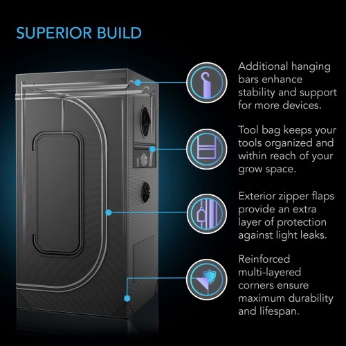 Constructed with ultra-durable 2000D oxford canvas, the CLOUDLAB grow tent also features reinforced 22 mm diameter poles—stronger than the standard 18 mm poles used in most grow tents. Featuring additional hanging bars, the tent is built to support up to 250 pounds of heavy equipment for long-term use. Reinforced tent corners and a heavy-duty floor tray provide added strength and protection, while the front zipper flaps and 500G light-proof layer offer another level of defense against light leaks. Organize your grow accessories inside or outside the tent using the convenient detachable tool bag. Additional cinched duct ports allow you to easily install humidifiers, heaters, or A/C units without compromising the seal.