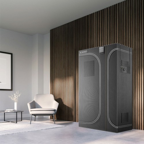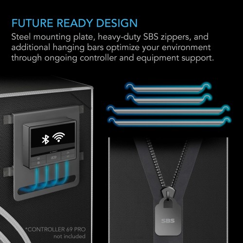 A grow tent designed to grow plants indoors by providing complete control over climate conditions. It features a secondary chamber where the top half is used for plants in their vegetative stages, and the bottom half for those in their seedling stages. This grow tent uses a waterproof oxford canvas with a 2000D thickness for higher durability and light-proofing. Cross-patterned diamond mylar lines the surface of the inner walls, which will reflect and maximize output from your grow light. The genuine SBS™ zippers ensure maximum convenience by smoothly and securely gliding along the track. An inner ribbon stitching creates a seal that lines the SBS™ zipper inside the grow tent to ensure maximum reflectivity and prevent light leaking. This is paired with a protective cover that runs the length of the front zipper for further protection against intrusive lighting. The duct ports can also close on either side to reinforce this light-proof sealing. Accessories include a waterproof floor tray, a detachable tool bag, additional roof hanging bars, and a mounting plate to install your controller onto the grow tent.