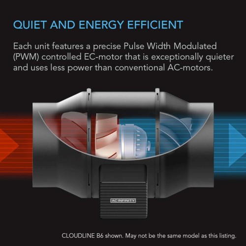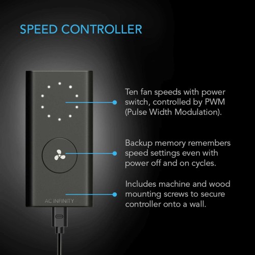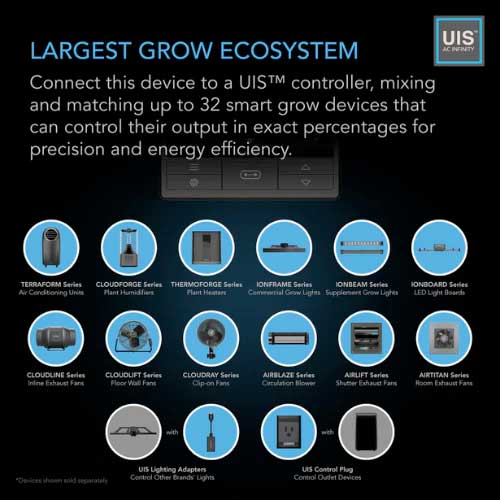 The speed controller enables you to set the duct fan’s speed to optimal noise and airflow levels for various environments. This inline fan is equipped with the CLOUDLINE Series’ same EC-motor that is precisely controlled using PWM (Pulse Width Modulation), which enables it to run smoothly at extremely low RPM speeds without generating motor noise. Ten speed options are available with power switch and backup memory. This model can be connected to the following smart controllers to share the same programming and power source as other EC-motor CLOUDLINE fans: