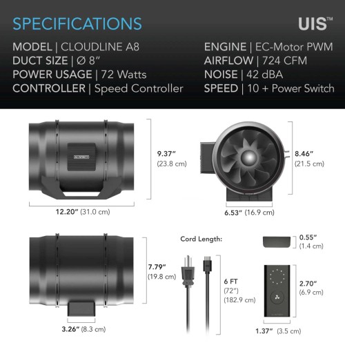 Cloudline Lite A8, Quiet Inline Fan With Speed Controller 8" 200mm by AC Infinity