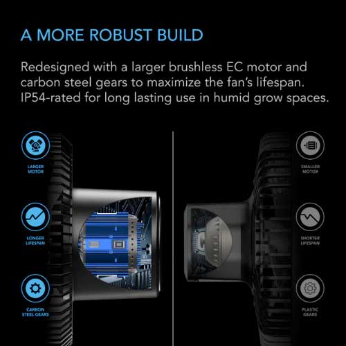 This clip fan features a robust EC motor specially designed in size and construction to lengthen oscillation lifespan. Its clamp is re-engineered with a compact metal build that saves space in your grow tent and uses a vise grip-like design for greater security on tent poles. Other reinforced features include a brushless motor design, resilient carbon steel gears, and dual-ball bearings for omnidirectional mounting. These components create the heaviest-duty clip fan that is long-lasting, energy-efficient, and can generate powerful circulation.