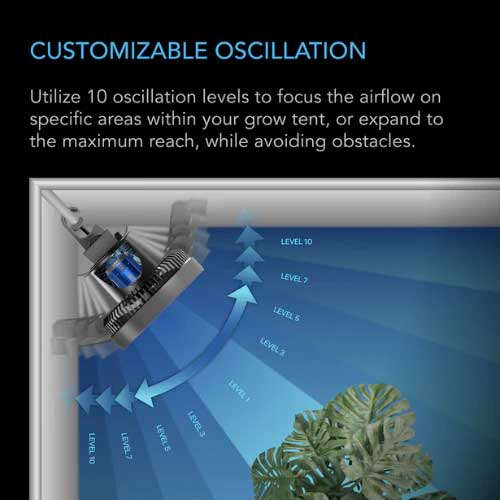 Get unprecedented customization capabilities for complete airflow control using this grow tent clip-on fan’s 10 speed levels, 10 dynamic wind modes, and 10 oscillation settings. Uniquely tailor each stage of development for a wholly personalized growing experience. Our wide selection of dynamic modes lets you decide the maximum strength of your varying wind flow, ensuring healthier growth with reduced stress on your plants. The oscillation range offers total tent coverage, being able to avoid obstacles. With this, you can set precise circulation for any plant growth stage, from ultra-gentle breezes for germination and seedlings to a powerful airflow for vegetative and flowering.