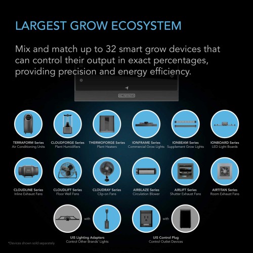 - Mix and match up to 32 devices from the largest platform of smart fans, grow lights, humidifiers, heaters, A/Cs, and grow lights & outlet devices from other brands.