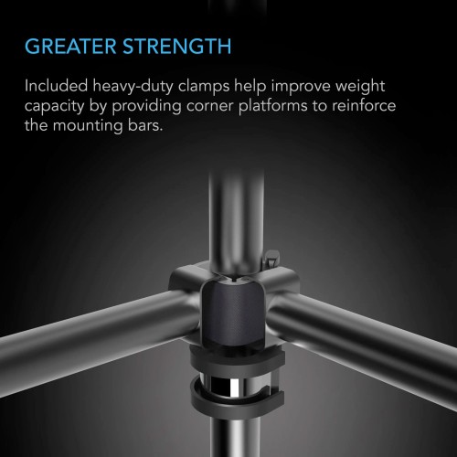 - Features heavy-duty support clamps that reinforce the mounting bars to double their weight capacity.