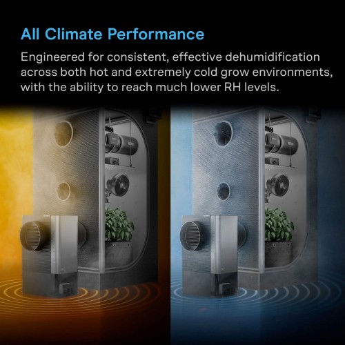 This next-gen plant dehumidifier delivers precise drying in hot and cold climates and smart-controller compatibility for up to 5×5 grow tents. Dual duct ports enable exhaust ducting to deliver dry air into tents, with optional intake support for an efficient closed-loop operation. Drainage-ready design features an internal reservoir with optional gravity drain hose for clean, low-maintenance operation.