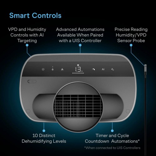 On-board humidity and VPD controller with a precision corded sensor, featuring intelligent AI programming that dynamically adjusts drying output in exact percentages to maintain your ideal climate. Integrated UIS™ port supports connection to our smart controllers, providing Wi-Fi app access with advanced automations, AI unified climates, data charts, alerts, grow guides, and more.