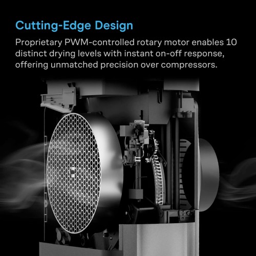 Proprietary PWM-controlled rotary motor delivers 10 distinct drying levels with instant on/off response, offering unparalleled precision over compressor-based dehumidifiers. Engineered to deliver consistent, effective dehumidification in both hot and extremely cold grow environments, and the ability to reach humidity levels as low as 25% RH.