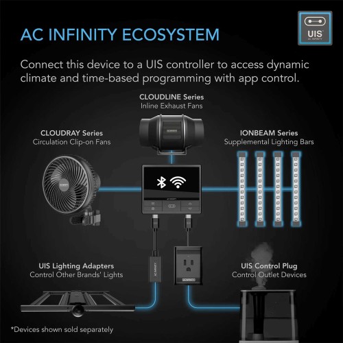 This kit includes an intuitive controller that features ten brightness intensity levels with OFF, ON, and SCHEDULE modes. The lights can also be connected to our smart UIS controllers to integrate with other grow equipment and access dynamic climate triggers, grow cycles, and app control.