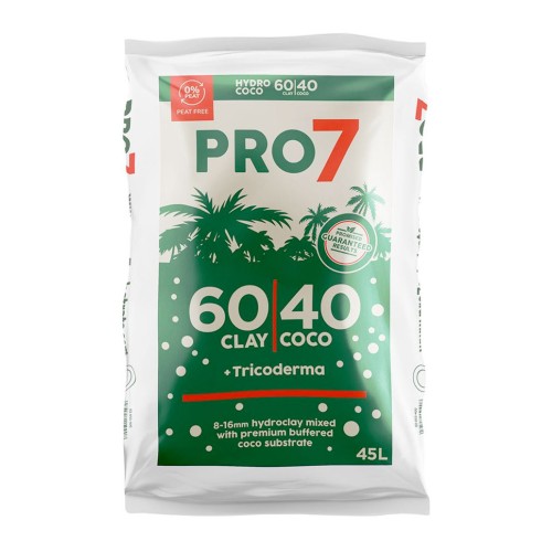 PRO7 60/40 CLAY COCO is a great growing medium. A mix of 40% pre-washed and buffered professional quality coco coir and 60% European expanded clay pebbles (8 – 16mm). Ready to use and Ideal for flood and drain and drip Irrigation systems, in passive hydroponics, or as hand-watered growing media in potting. The mix of clay pebbles and coco-coir fibre gives excellent aeration and allows sufficient water retention with great drainage and no fear of waterlogging. Promotes rapid and strong root development and thus healthier, more vigorous plants. Encourages naturally-occurring trichoderma which colonise the rootzone, aid root development, assist nutrient and water uptake, and provide defence against pathogens.