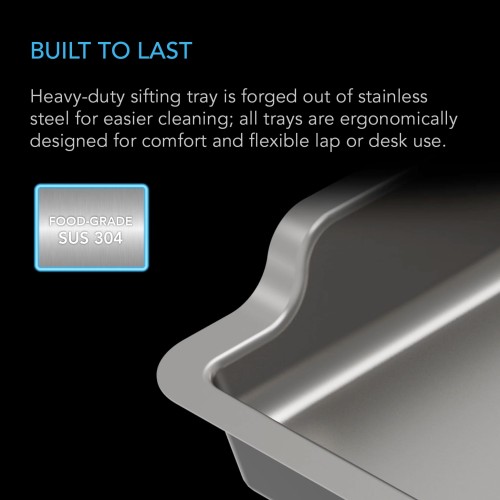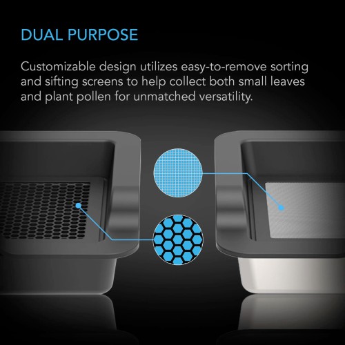 - Interchangeable 3-tray kit with sorting and dry sift screen is optimized for catching small leaves and pollen.