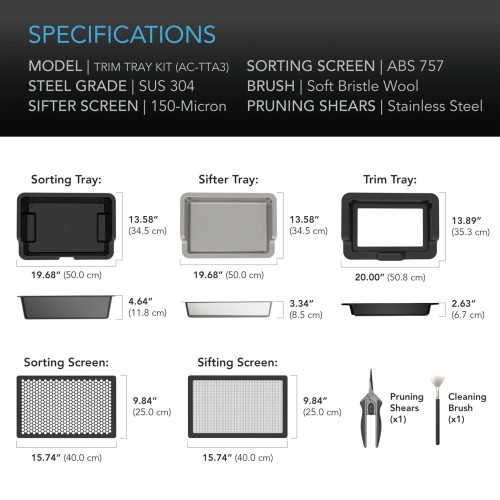 - 20" x 13.8” x 4.8” sorting, sifter & trim trays | 150-micron sifter & ABS 757 sorting screens | Pruning accessories
