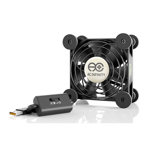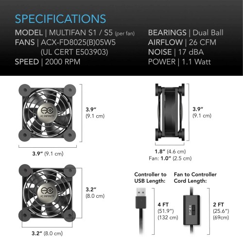 The ultra-quiet cooling fan can be positioned to stand upright or laid flat to cool various electronics and components. Features a multi-speed controller with power switch. Includes eight large anti-vibration rubber feet and a 6-foot power cord. The USB plug can be plugged into the USB ports found behind popular electronics such as receivers and video game consoles. Each unit contains an additional USB port, up to four fans can be daisy chained together to share the same power source. This fan system is CE and RoHS certified and contains premium dual-ball bearings, allowing it to be mounted horizontally or vertically. Contains AC Infinity axial fans ACX-FD8025(B)05W5 which meet UL-507 standards for safety under Underwriters Laboratories certificate E503903.
