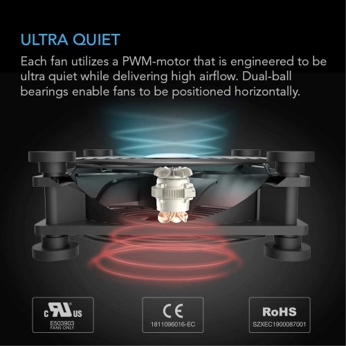 - Dual-ball bearings have a lifespan of 67,000 hours and allows the fans to be laid flat or stand upright.