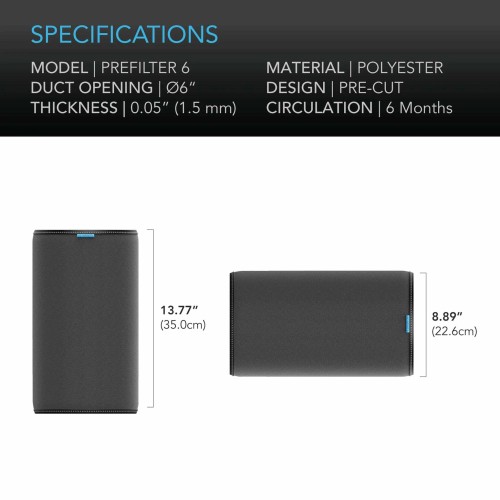 - Size: 8.89 x 13.77 in. | Fits 6-inch Carbon Filters | Thickness: 0.05” | Design: Pre-Cut | Colour: Black