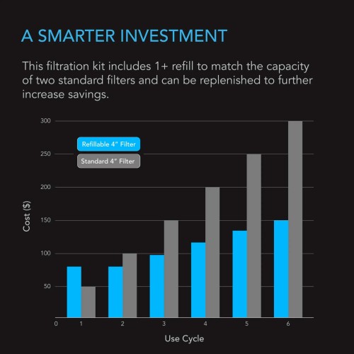 - Includes 1+ refill to match the filtration capacity of two standard 8” carbon filters while costing less.