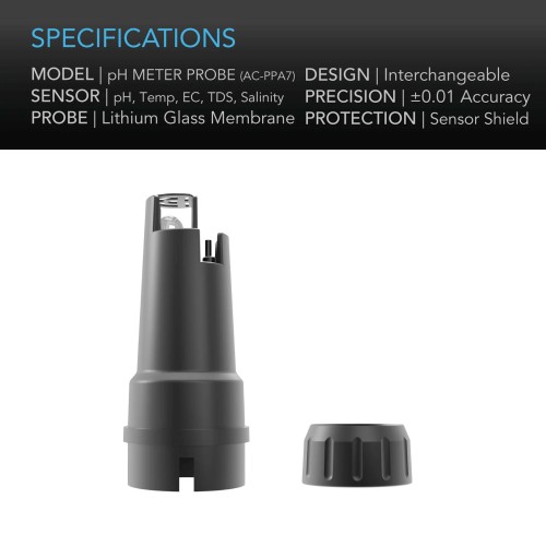 A replacement probe specially made for the AC Infinity Hydroponic Meter PRO to detect pH levels, measuring acidity and basicity in water solutions. Using this probe will increase your savings by eliminating the need to purchase brand-new pH meters. It features a lithium glass membrane that instantly detects water acidity, alkalinity, temperature, EC, TDS, and salinity and helps determine pH readings with precise ±0.01 accuracy. This glass membrane sensor is covered by a shield to protect it from impact and ensure the replacement probe’s longevity. Installation is hassle-free, creating a seamless seal that keeps the probe in place and water from leaking through.